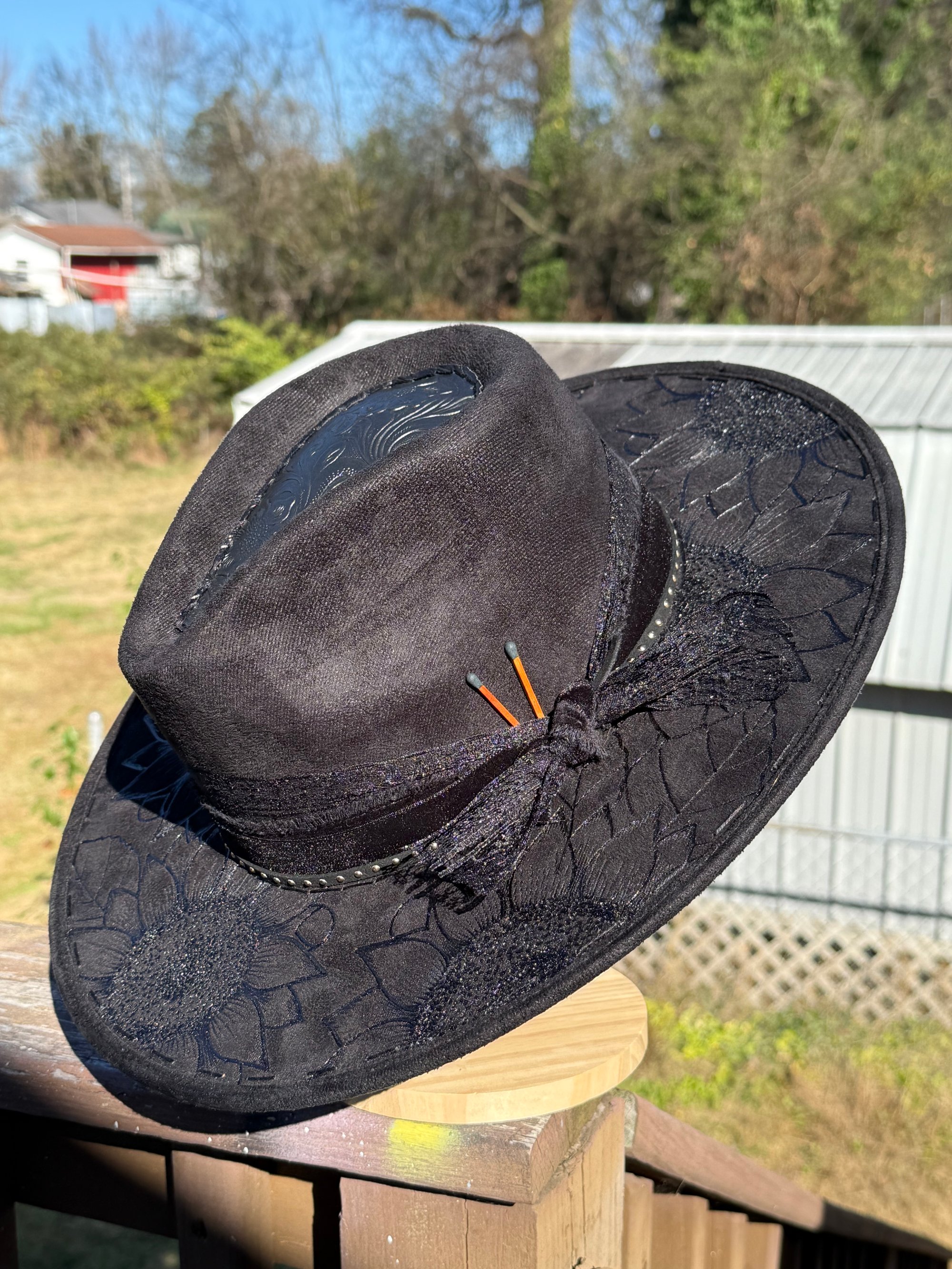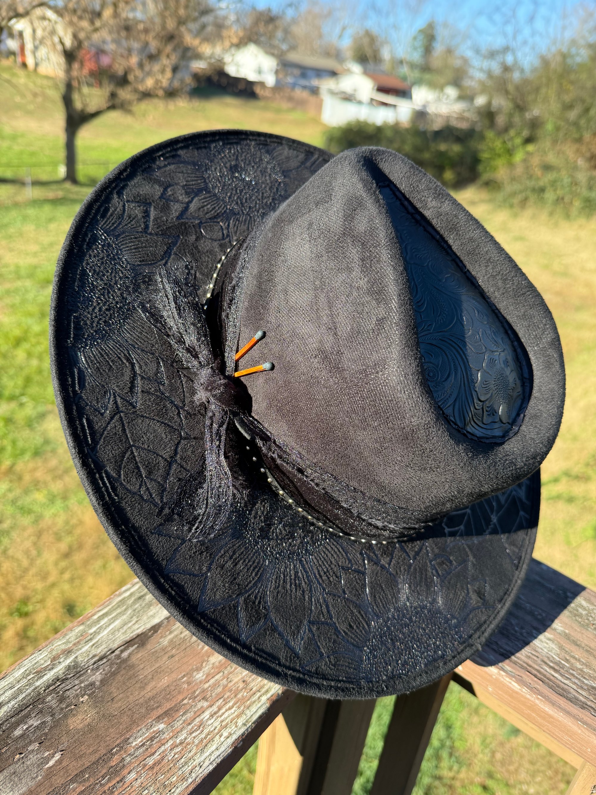 "Black Beauty" Black Tooled Leather, Hand Stitched, Hand Burned Sunflowers Suede Hat