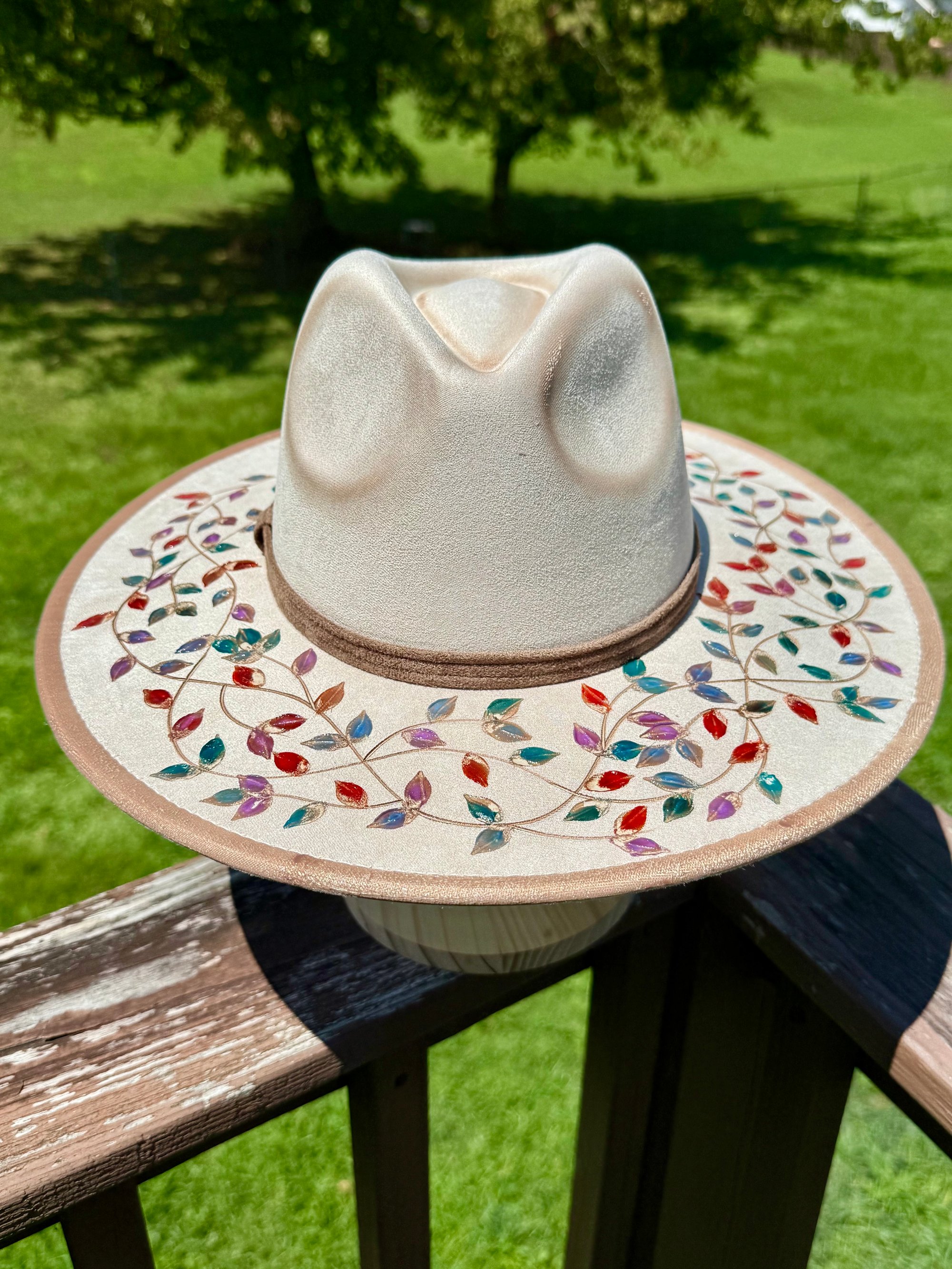 This is a very special design because the leaves are not painted on, but burned material from other hats that’s melted off and pressed onto another hat. It’s a truly unique concept that you won’t find anywhere else.
