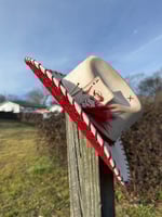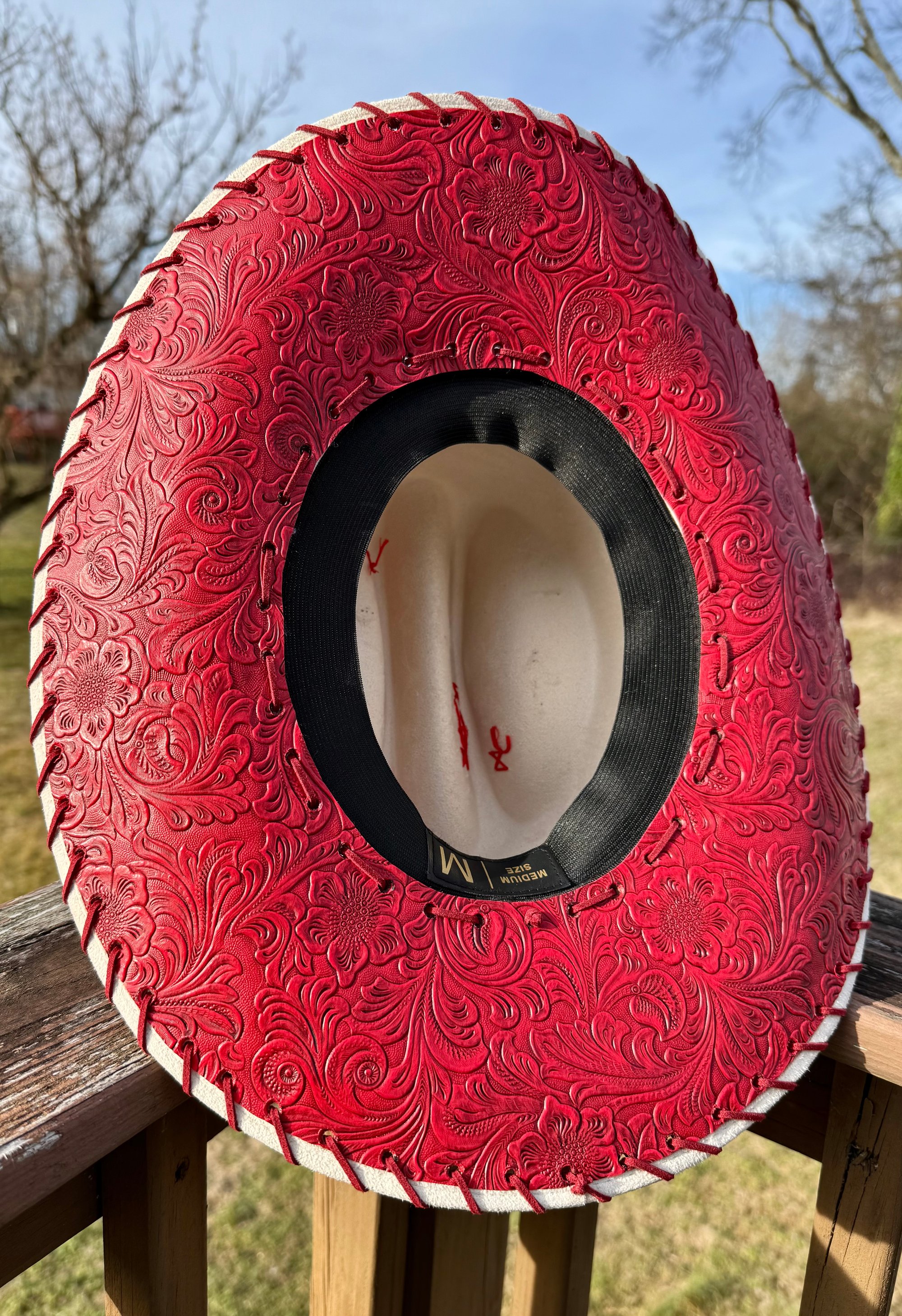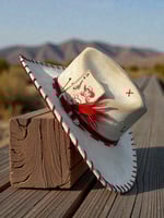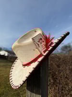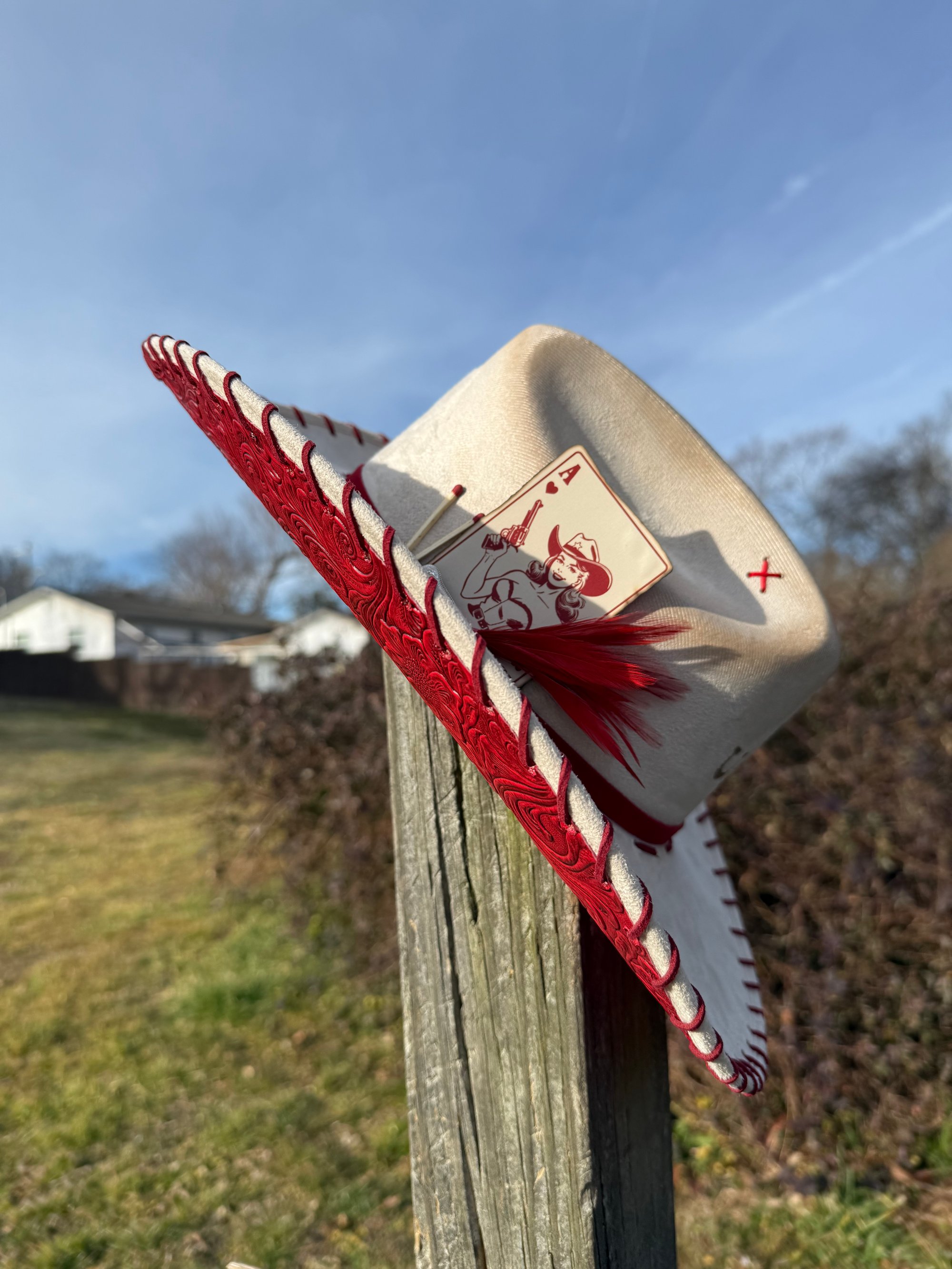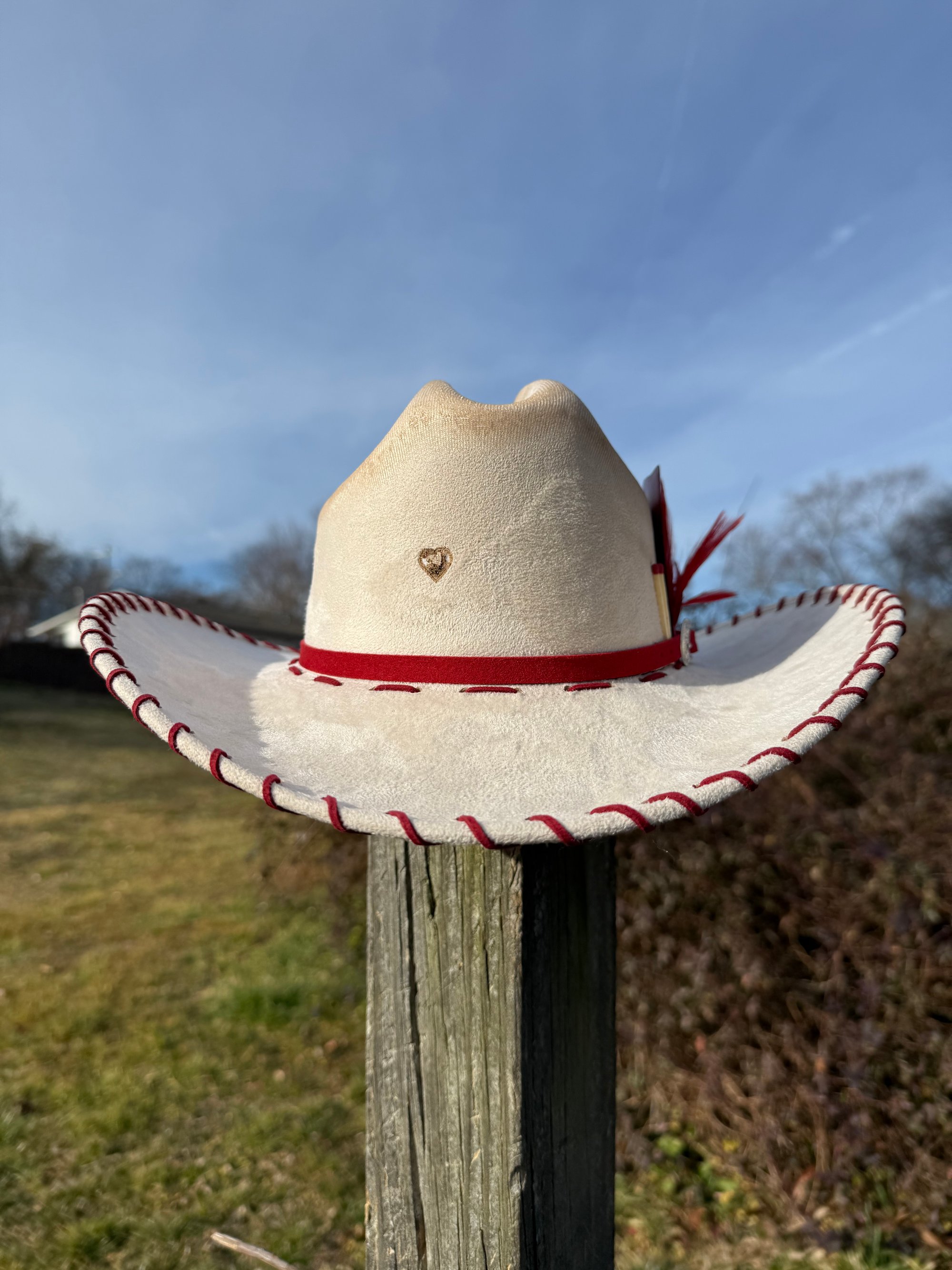 “Crimson and Love Her” Burned Cowboy Hat, Whipstitched Suede Hat, Red Leather Stitched Hat
