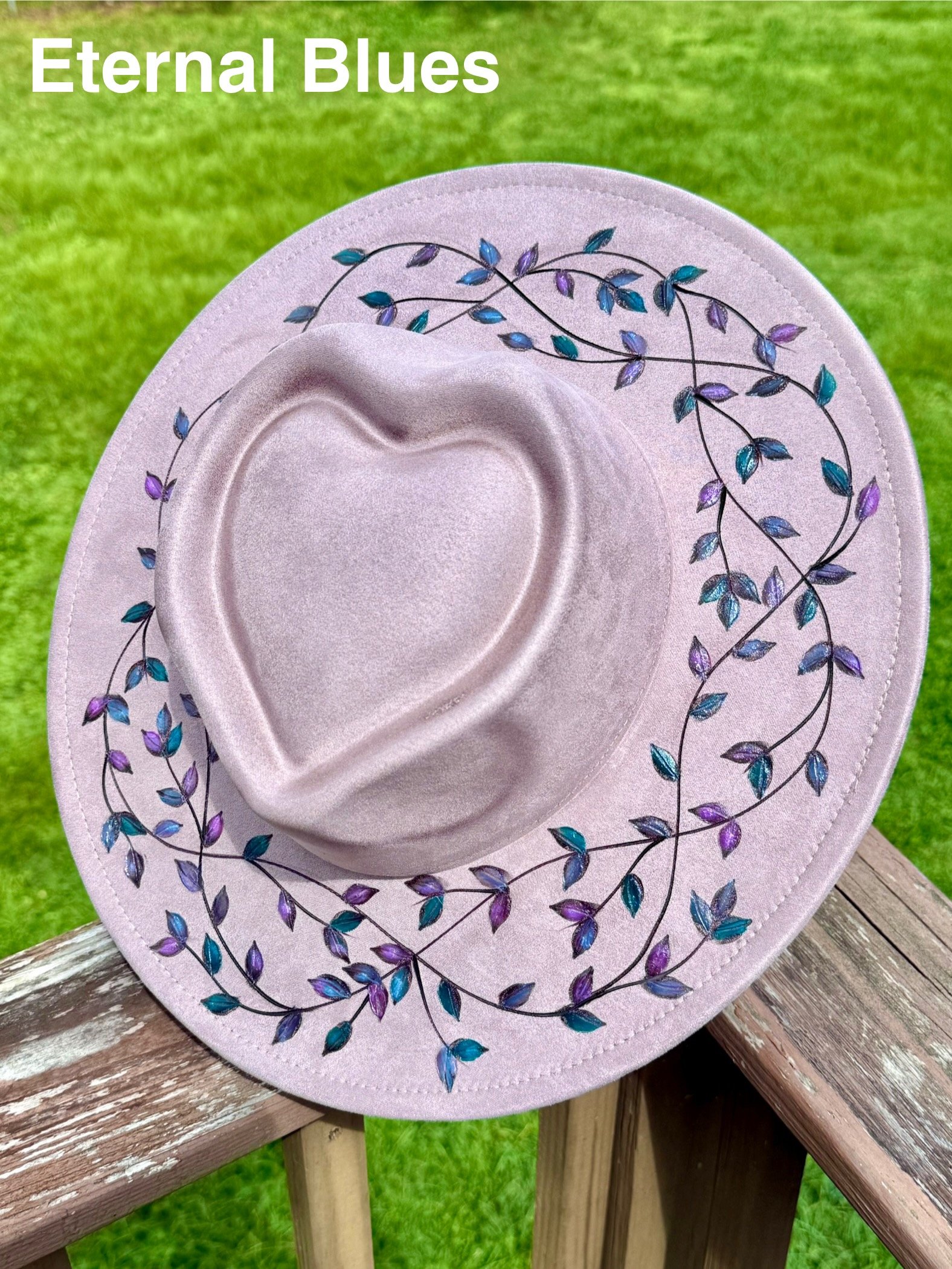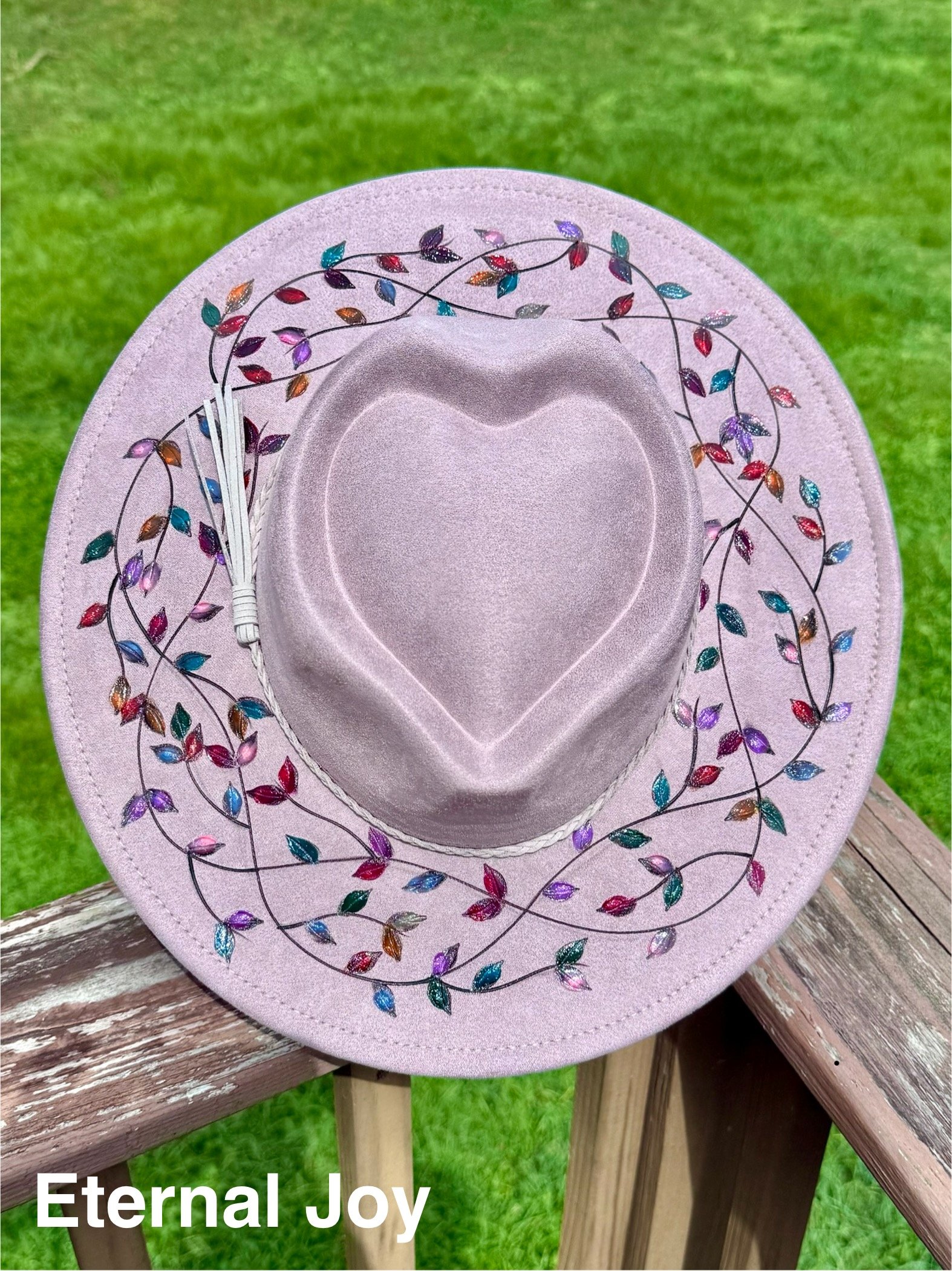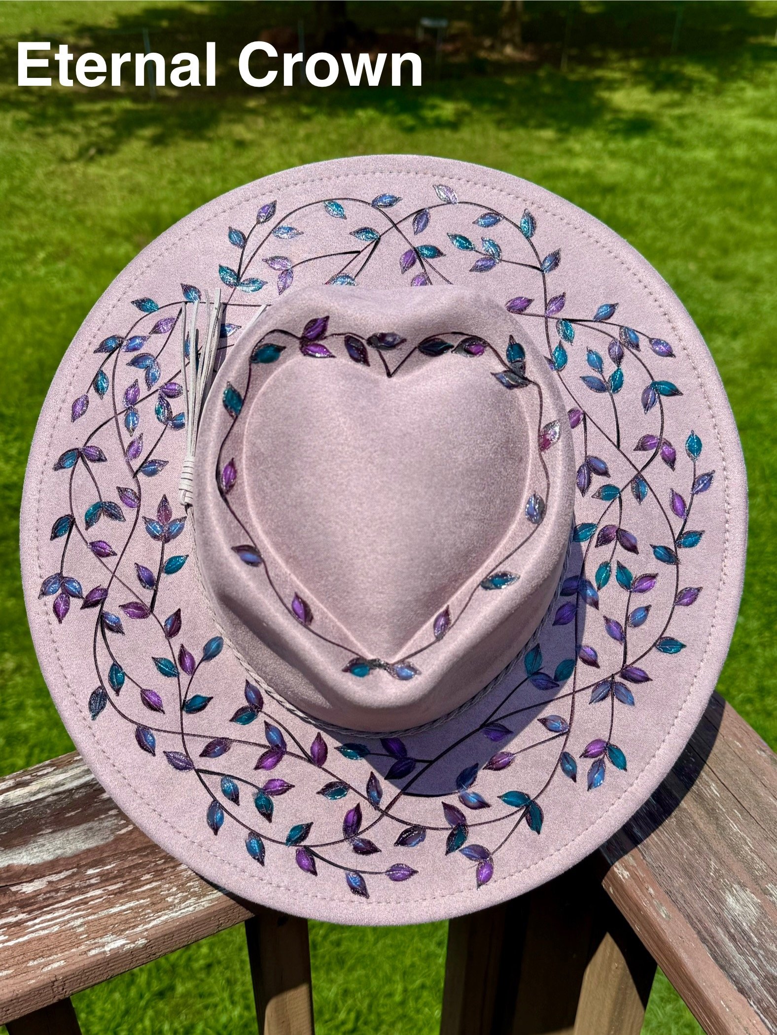 This is a very special design because the leaves are not painted on, but burned material from other hats that’s melted off and pressed onto another hat. It’s a truly unique concept that you won’t find anywhere else.