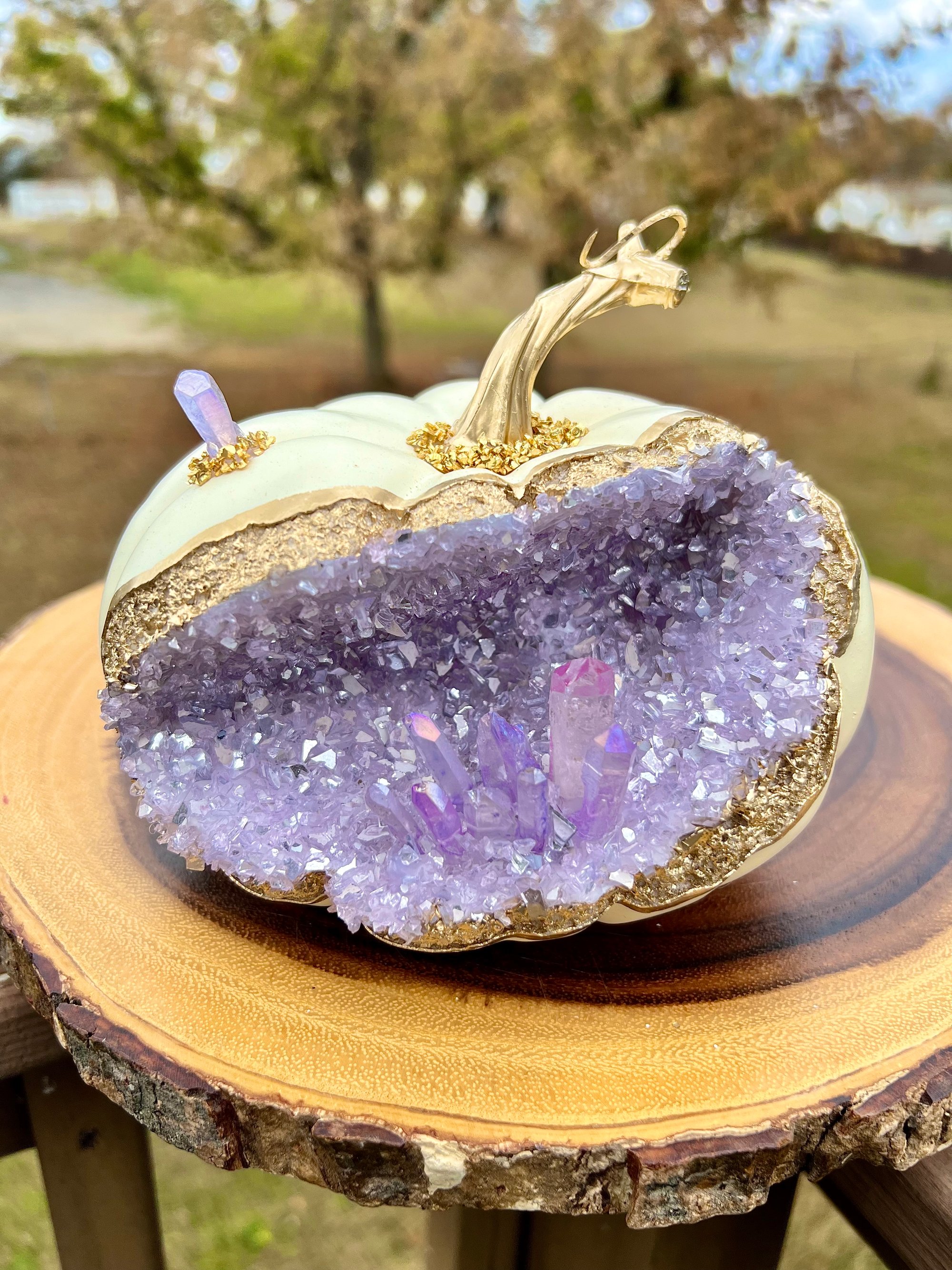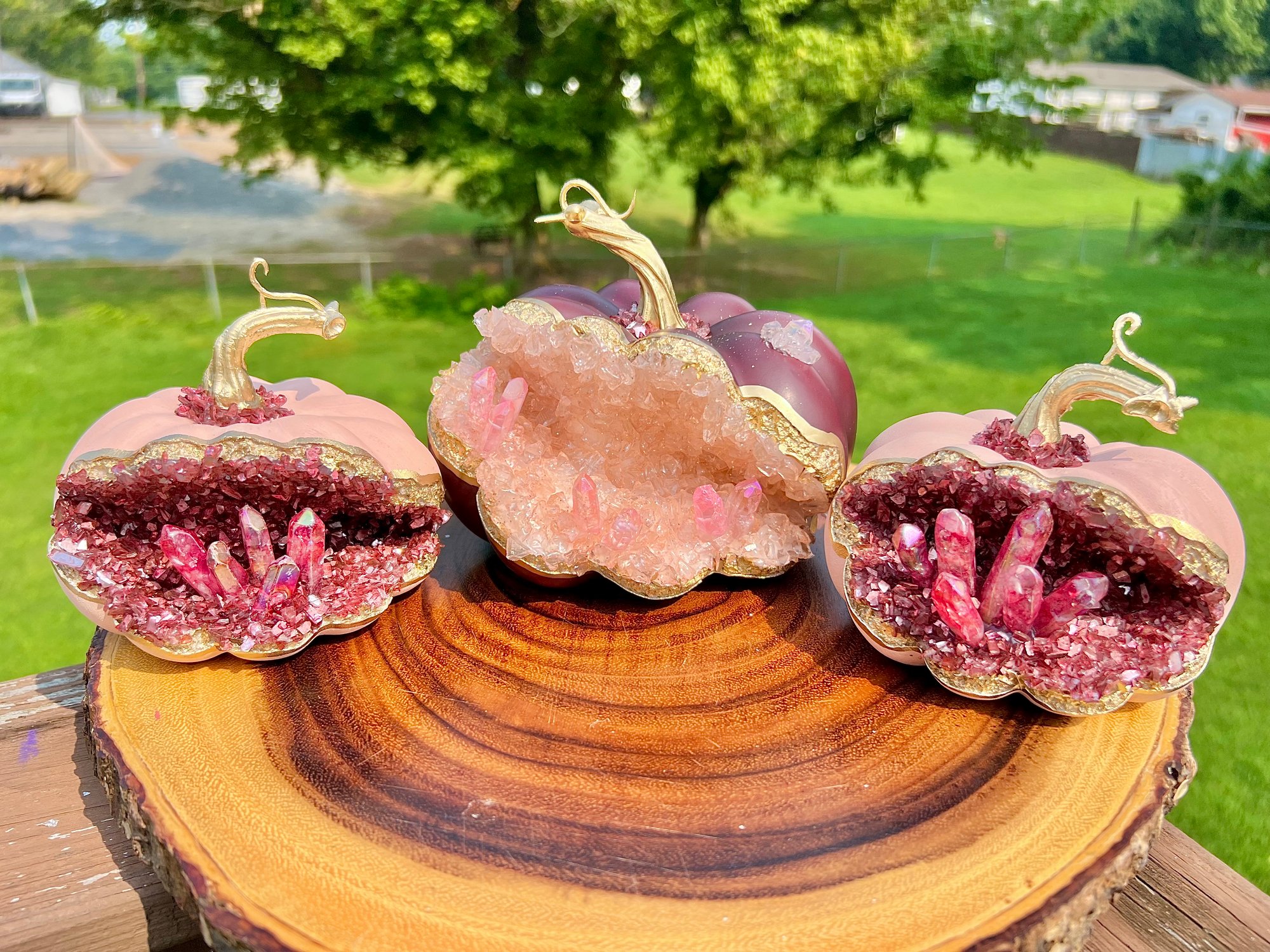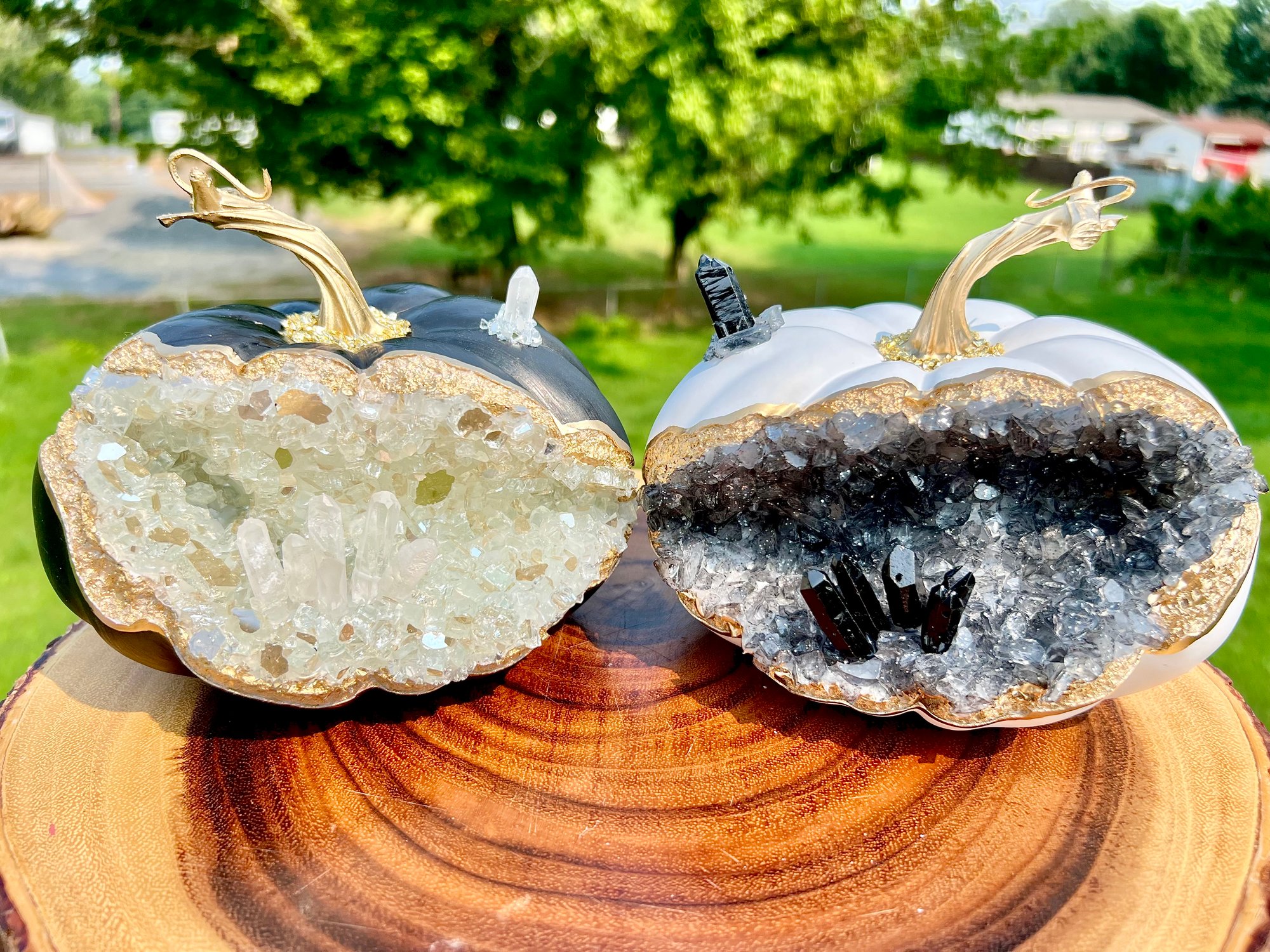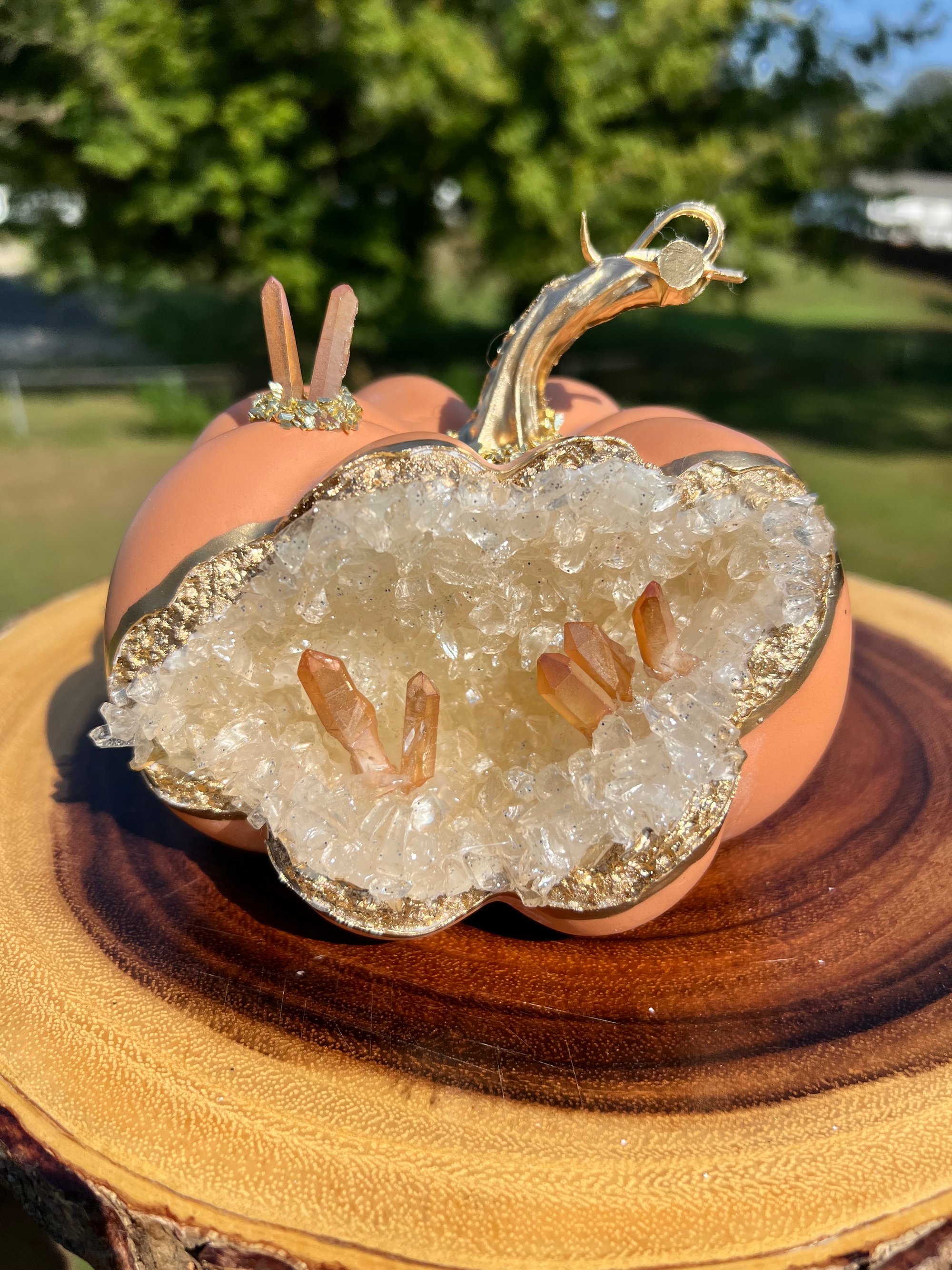 •MATERIALS: Each pumpkin is delicately made. Light weight, foam pumpkins carved out and filled with real quartz crystal points and faux crystal filler. Typically less than 1lb.
