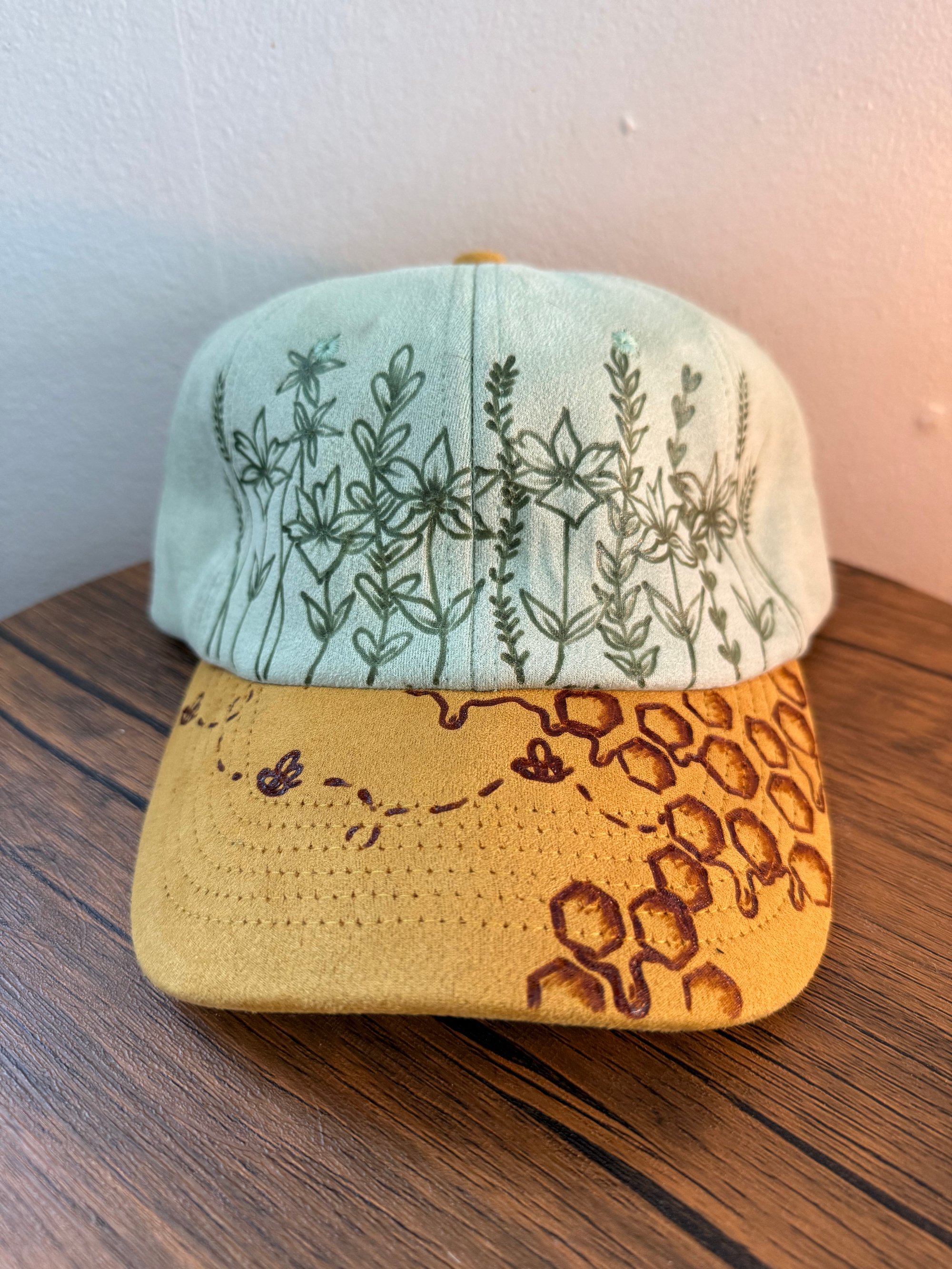 Honey Bee Honeycomb Wildflower Hand Burned Baseball Cap