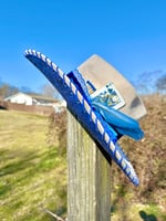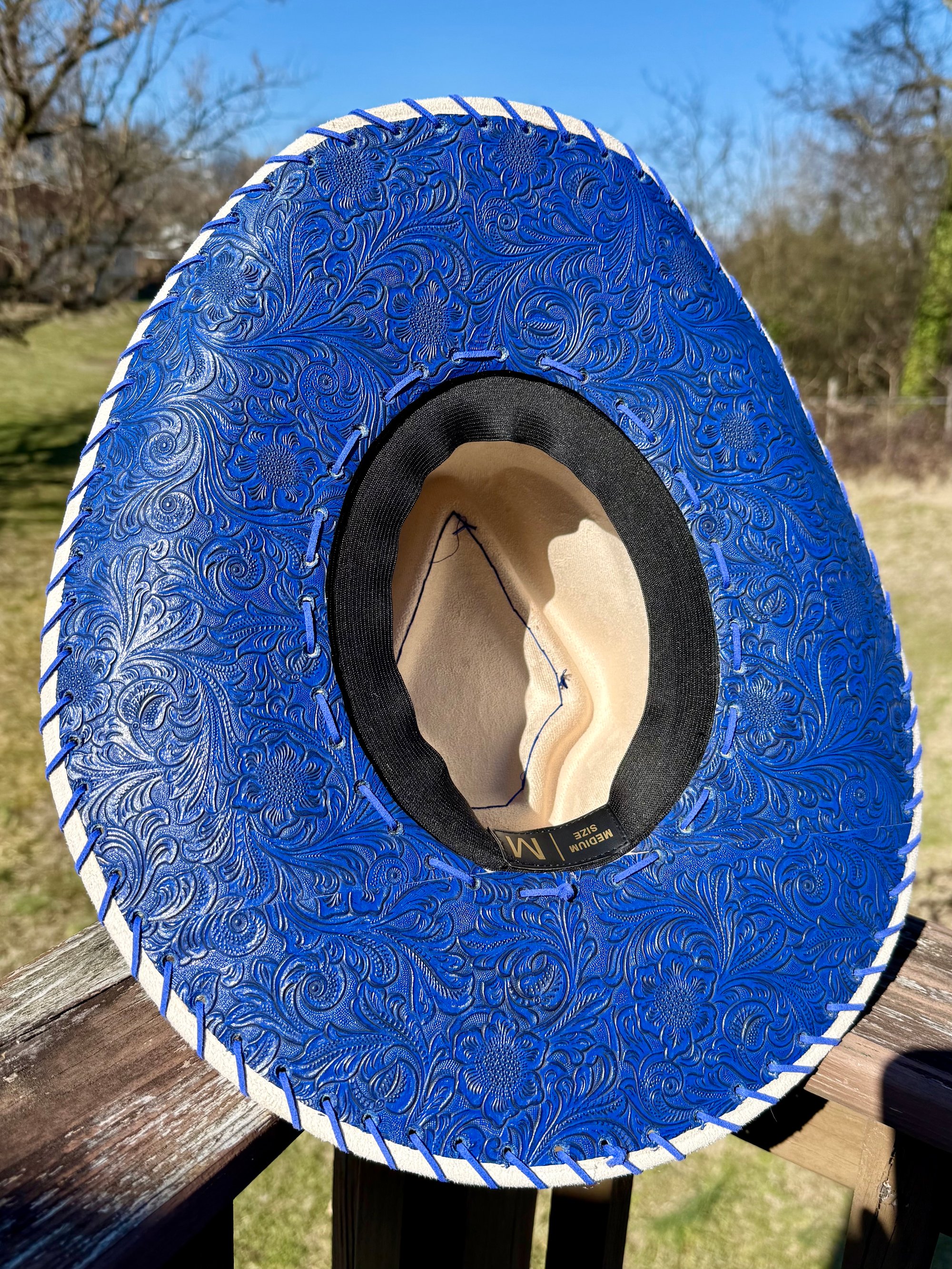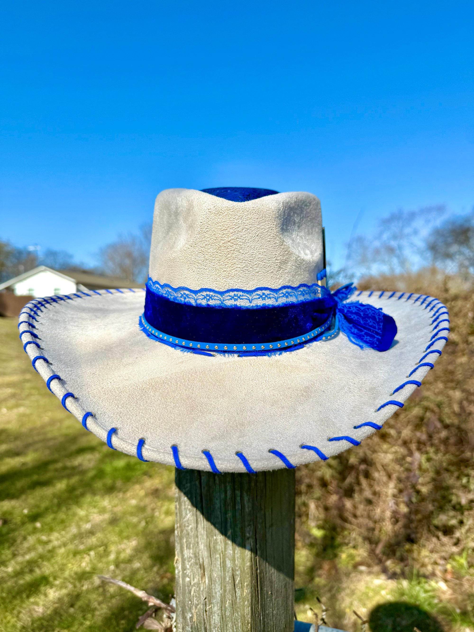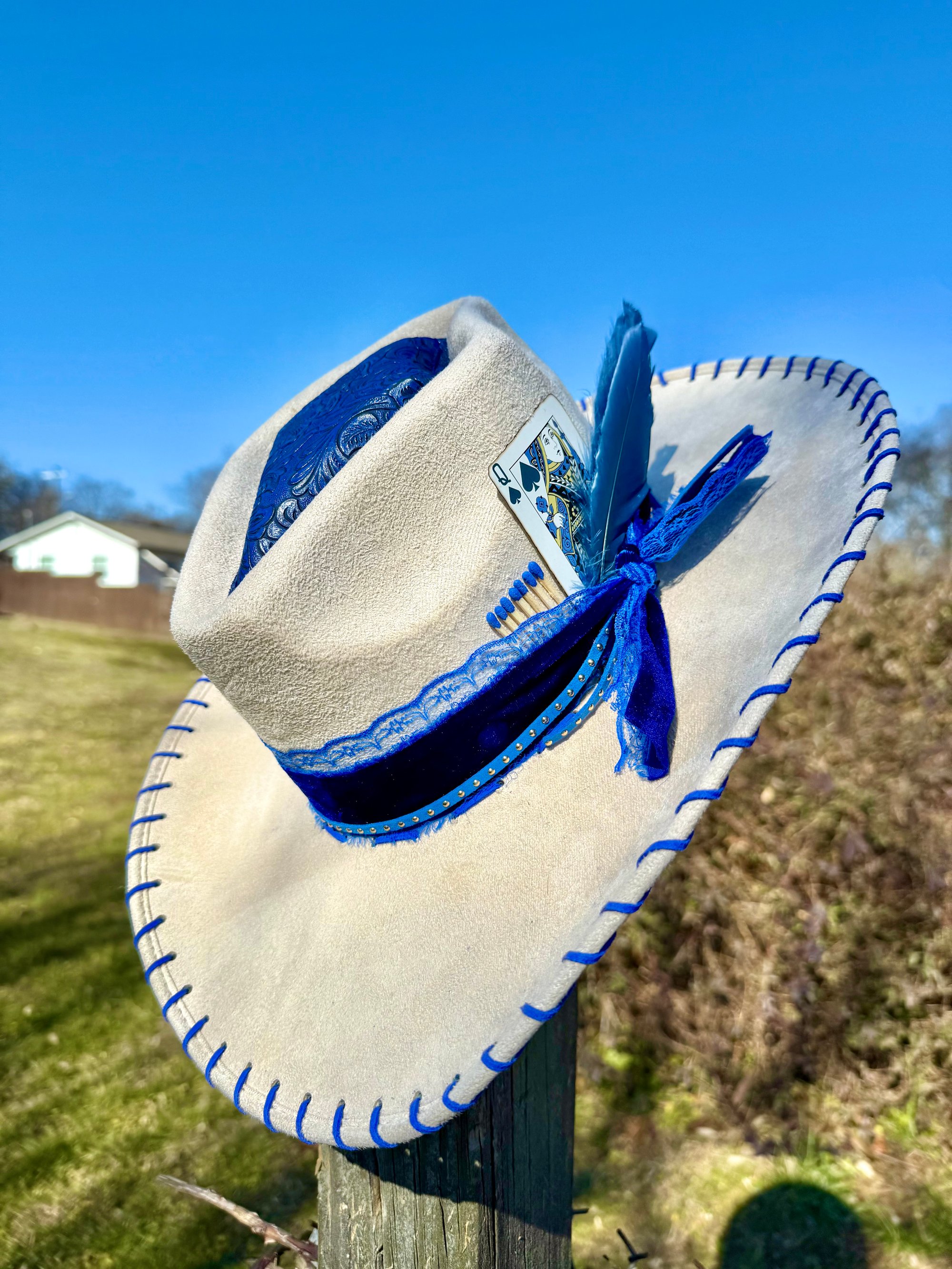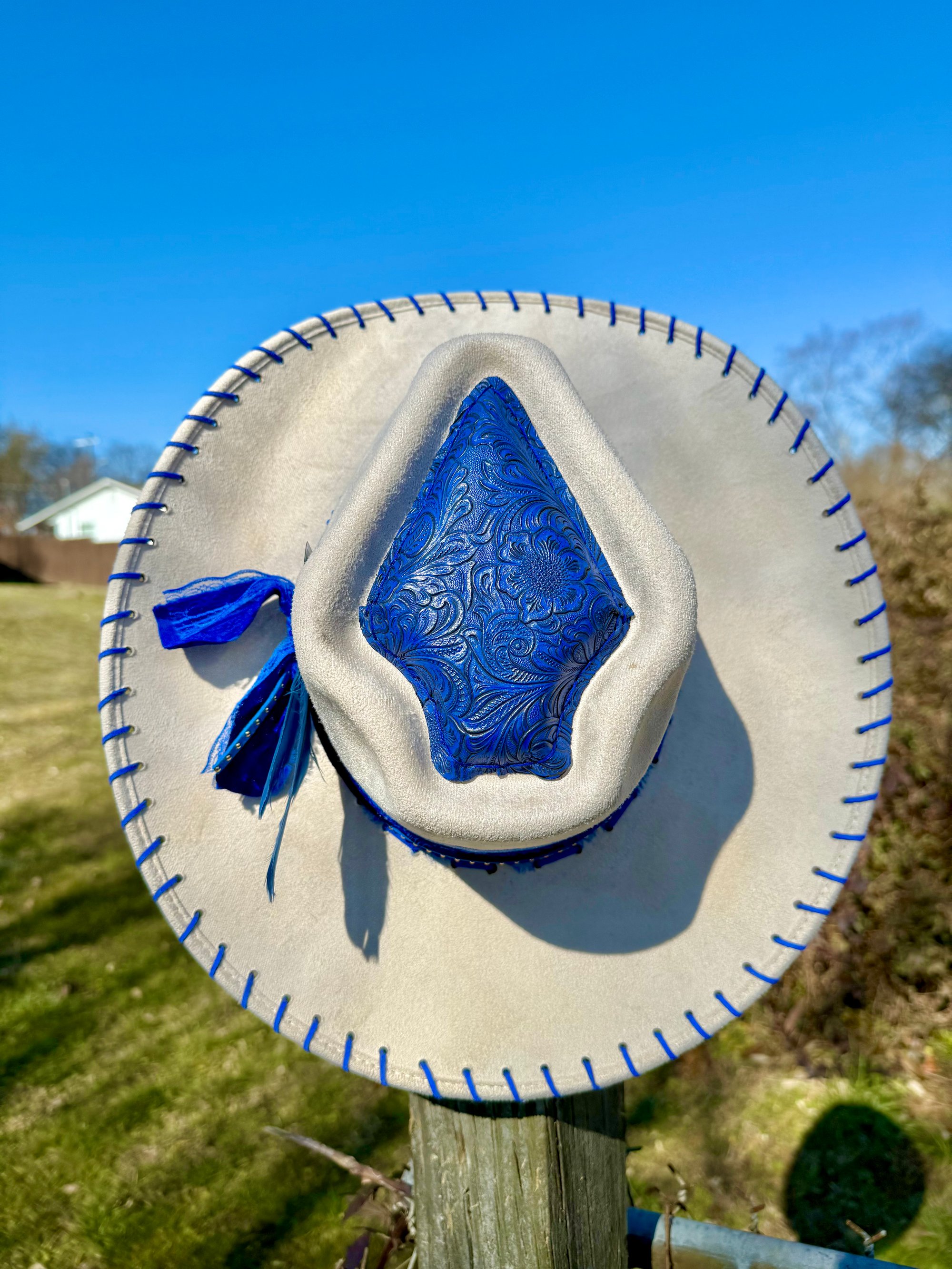 "Mrs Blue Sky" Burned Cowboy Hat, Whipstitched Suede Hat, Blue Leather Stitched Hat