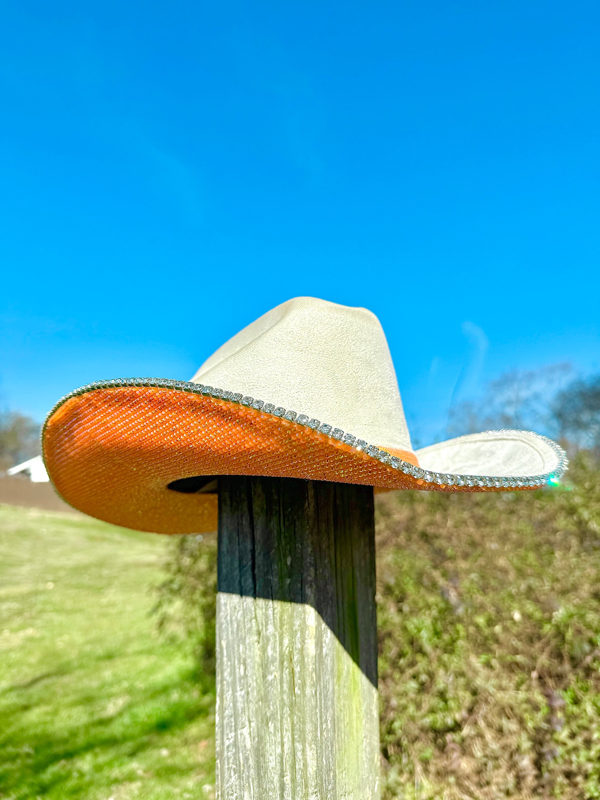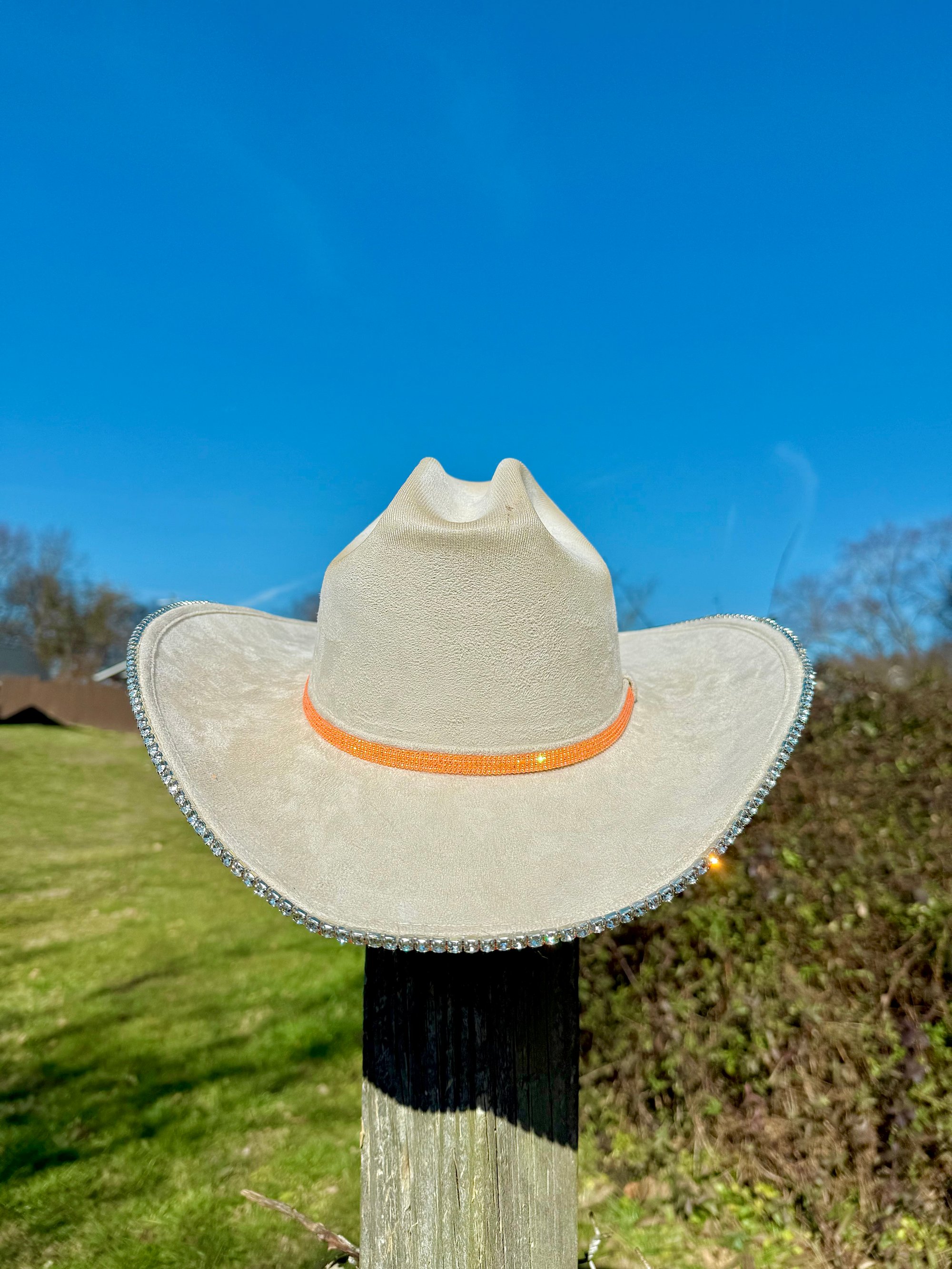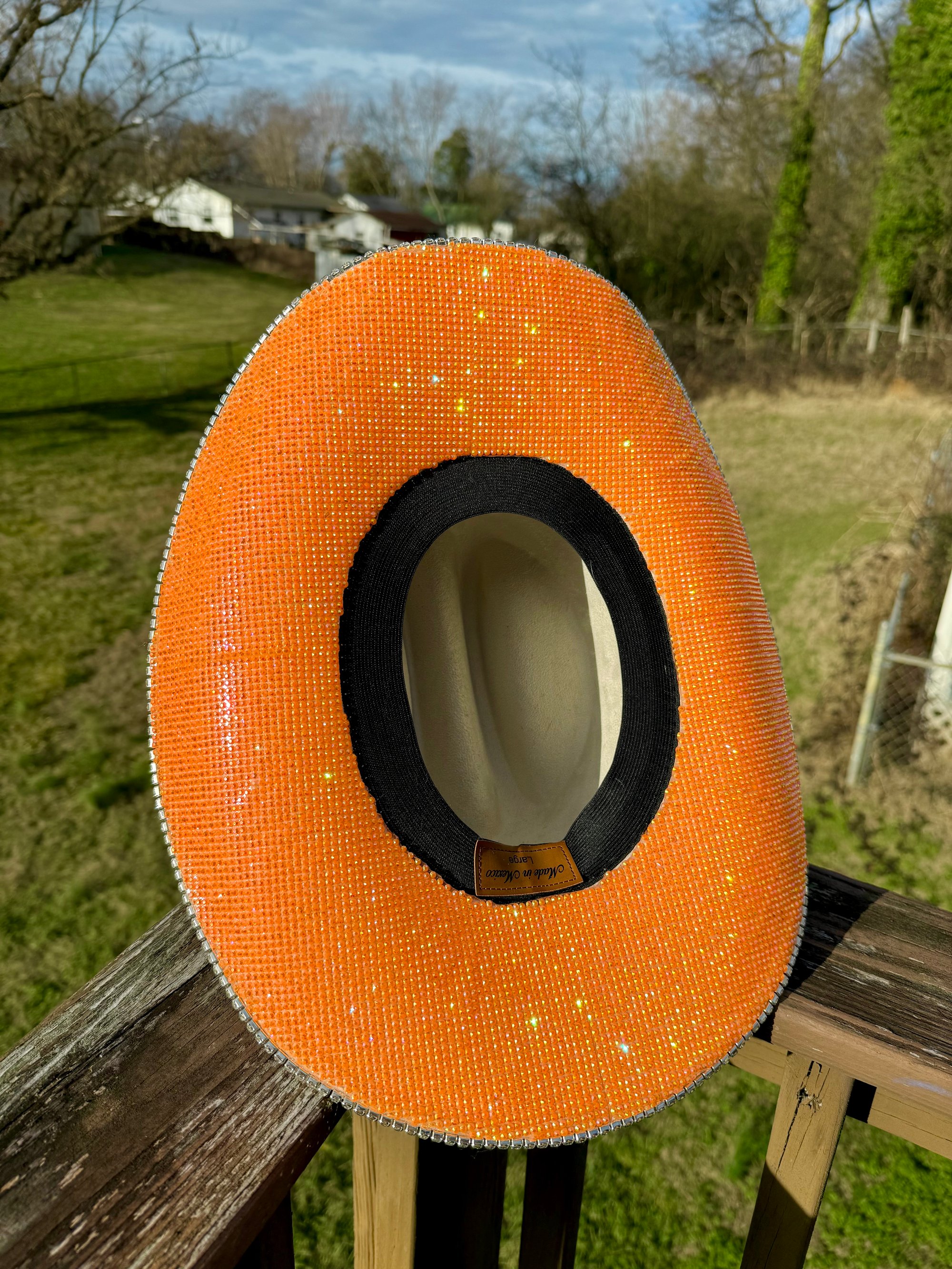 “Orange you Glad” Rhinestone Cowboy Hat, Covered Suede Heart Shaped Bedazzled Hats