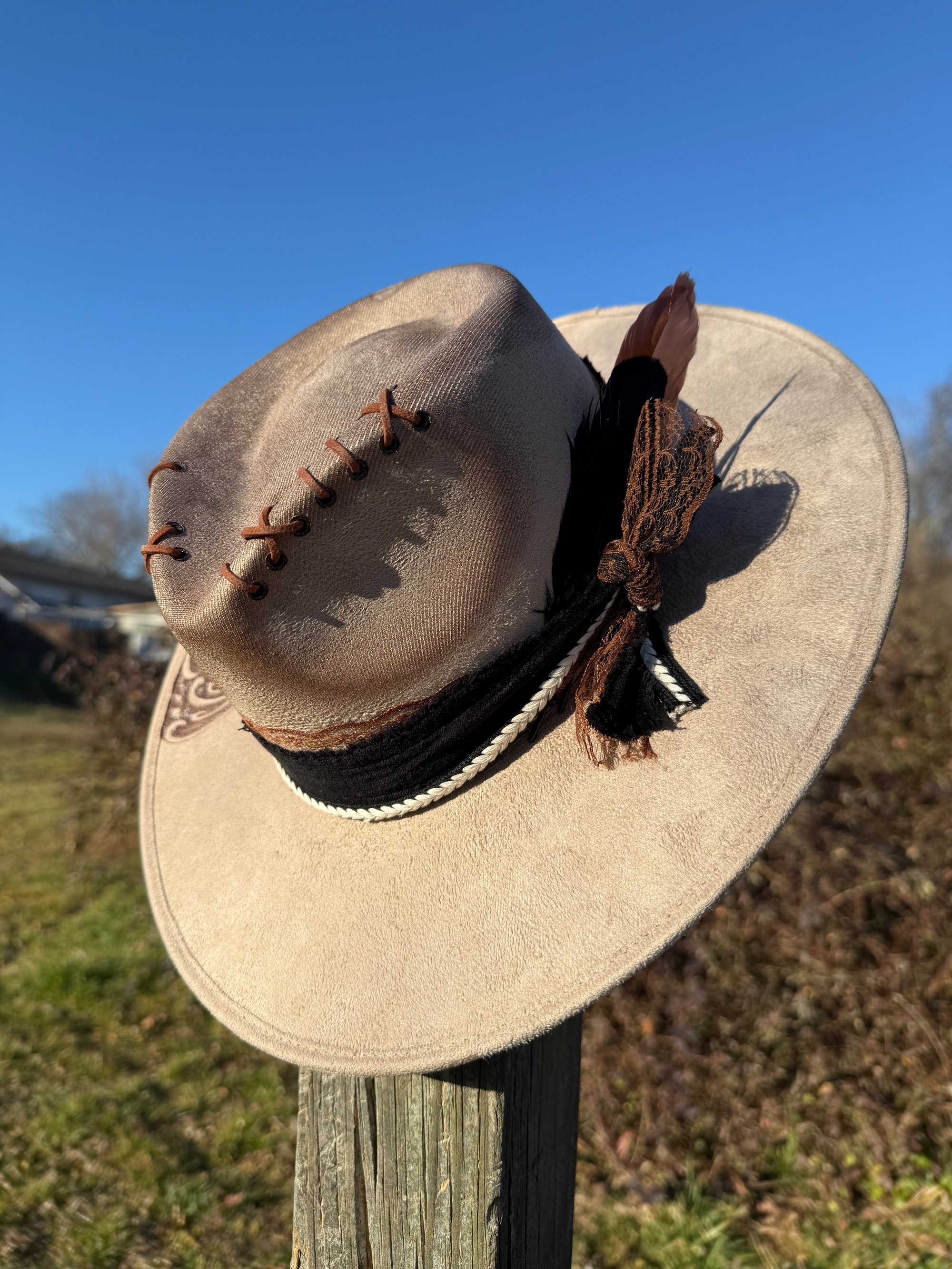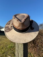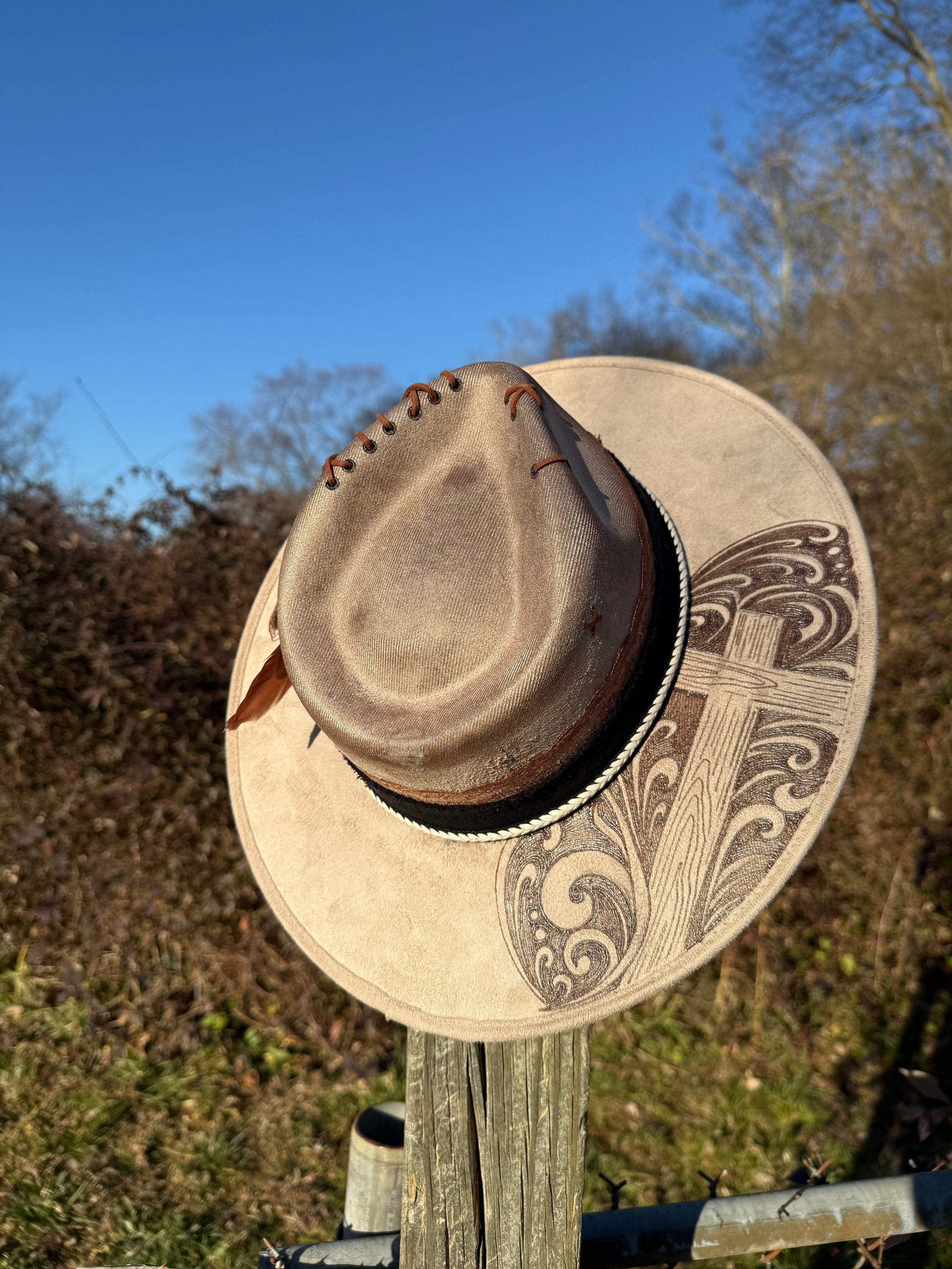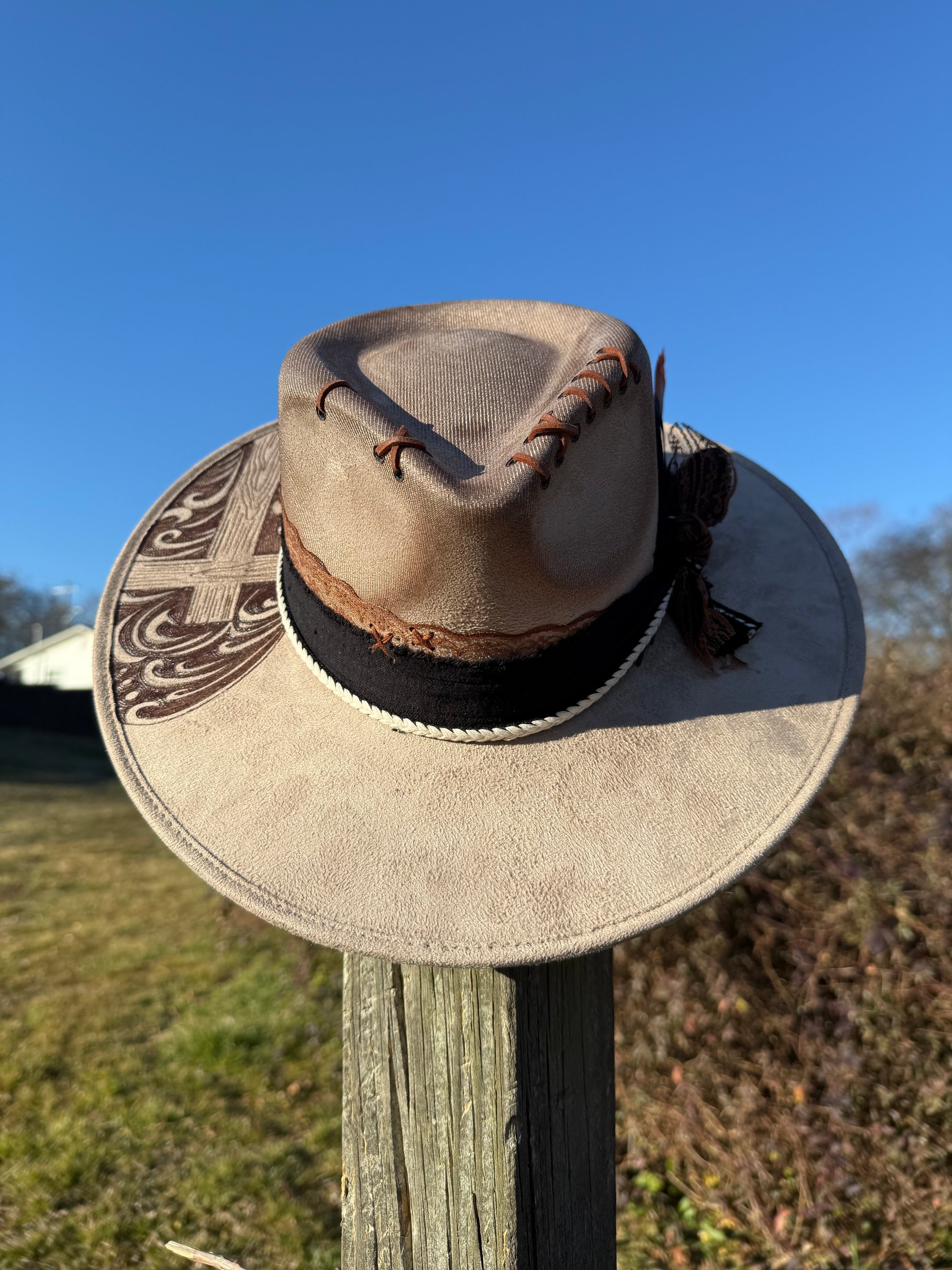 Design will differ slightly from hat to hat, including bands, stitch placement, and line work. Please allow creative differences since these are hand burned and not made with lasers.