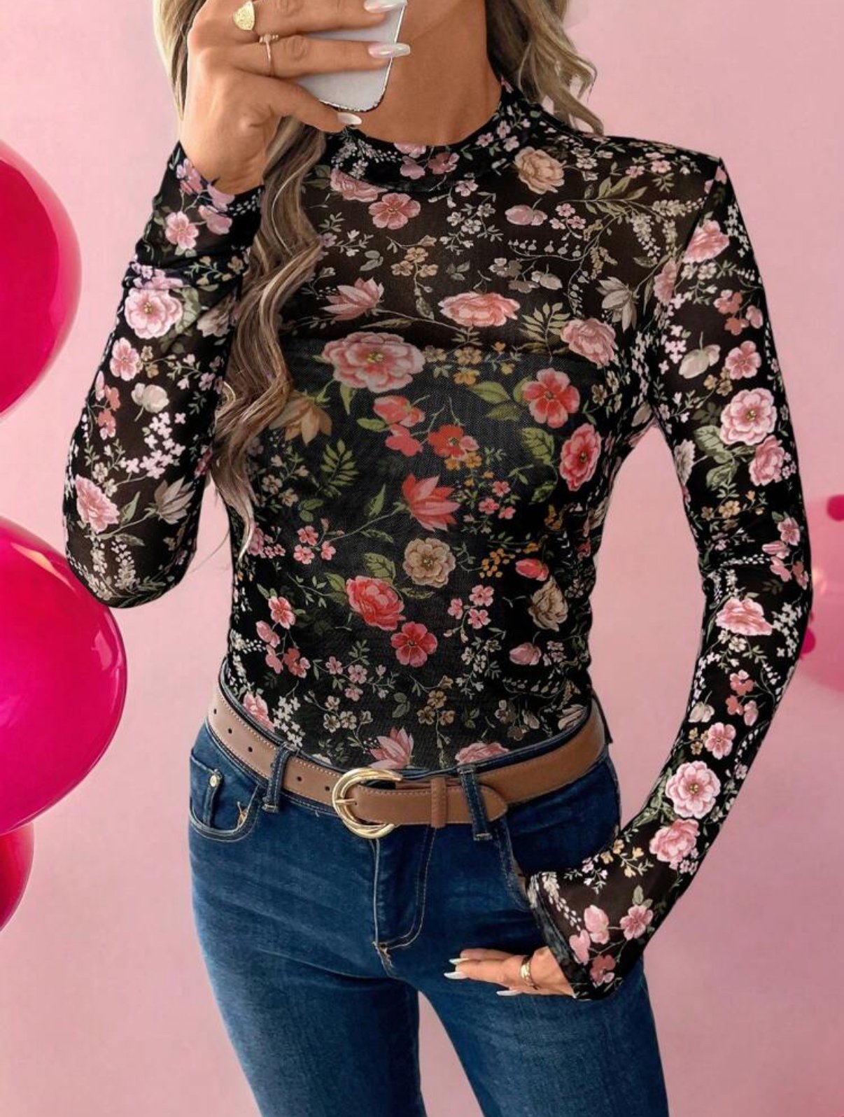 Sheer fabric with semi turtle neck for warm or cool weather.