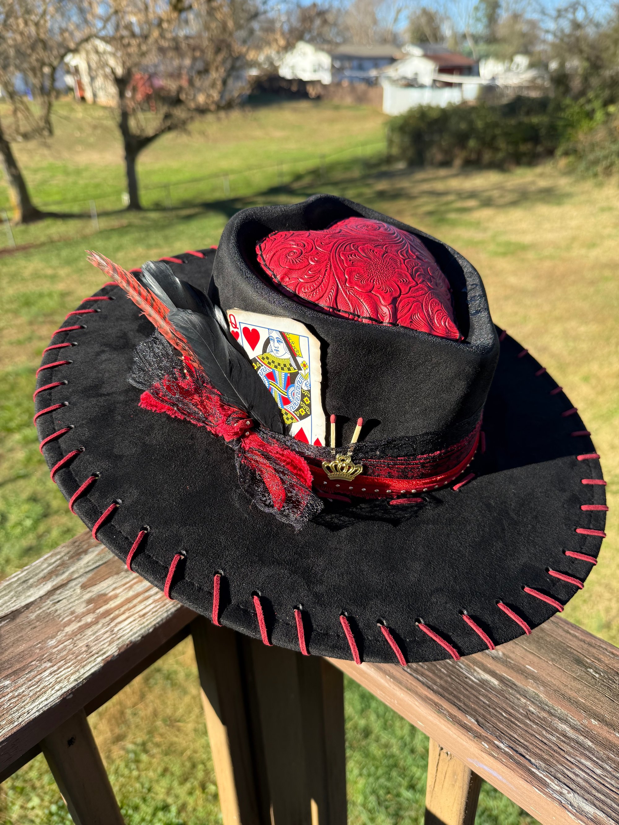 “She’s a Queen” Heart Shaped Burned Hat with Red Whipstitched Tooled Leather