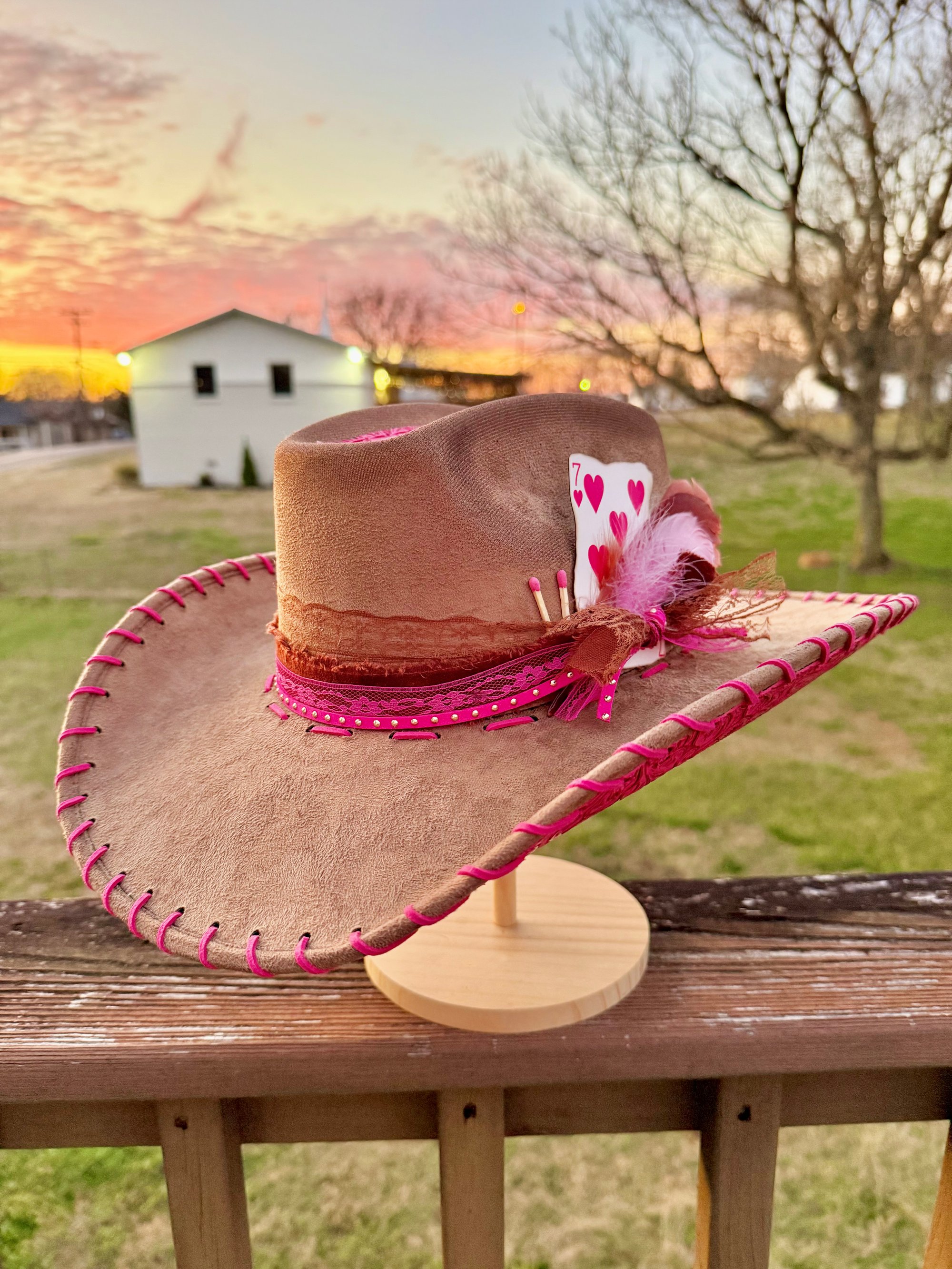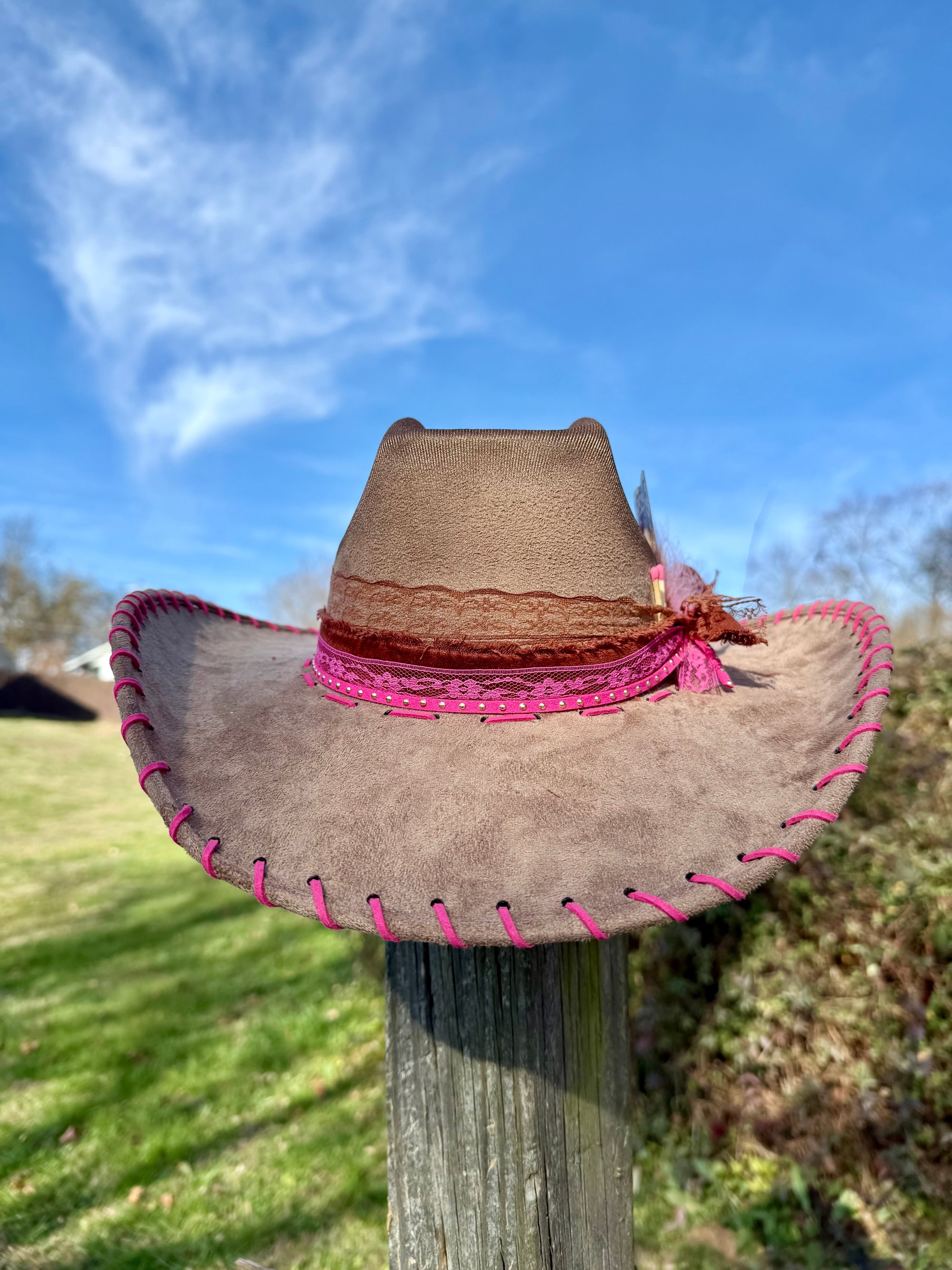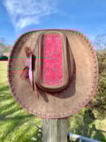 "Sunset on the Ranch" Burned Cowboy Hat, Whipstitched Suede Hat, Pink Leather Stitched Hat