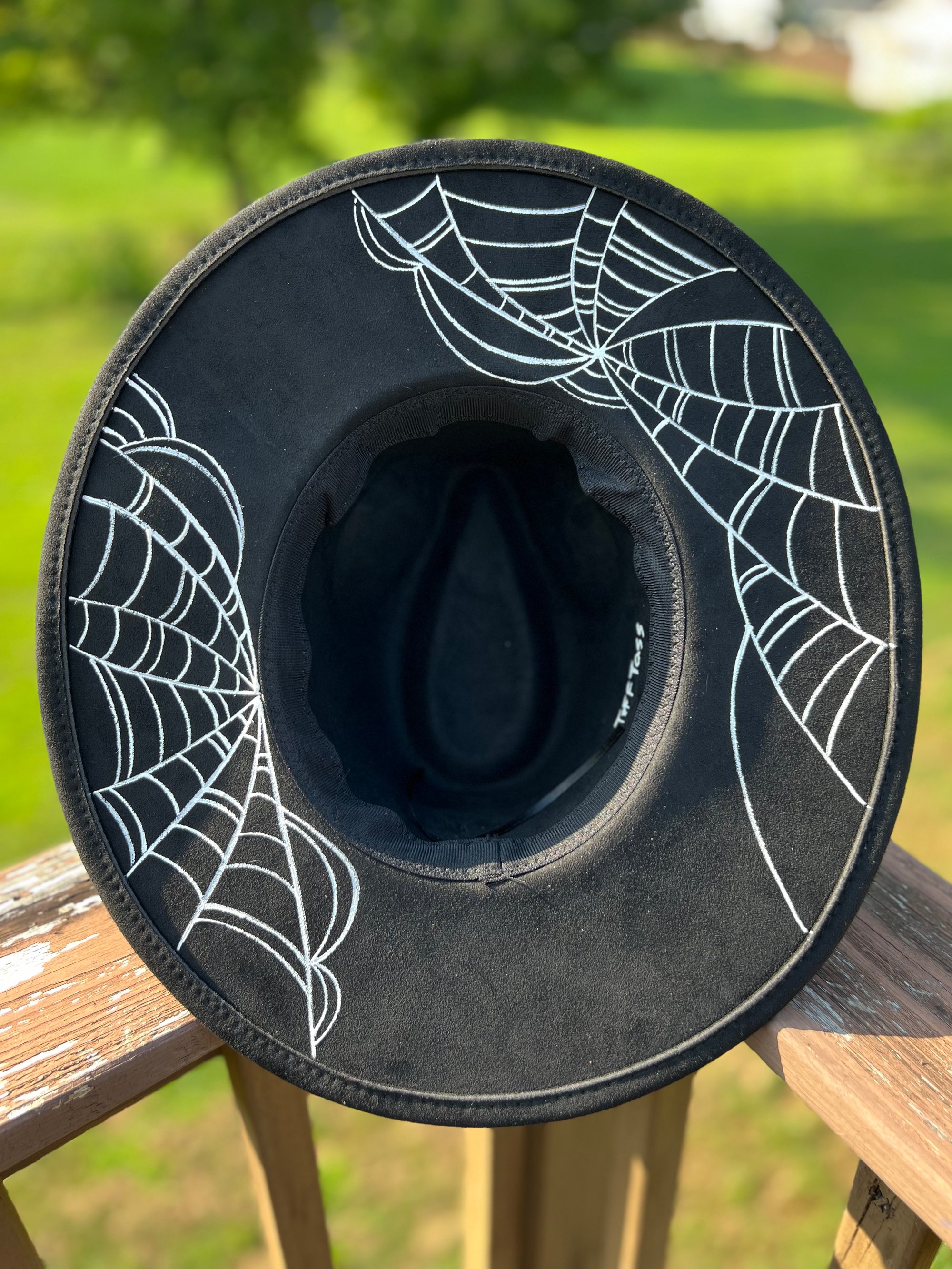 This hat is half painted to create its spiderweb appearance. Different colored bedazzled spider broaches are available!