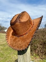 "Whiskey Neat XL" Burned Cowboy Hat, Whipstitched Suede Hat, Turquoise Leather Stitched Hat